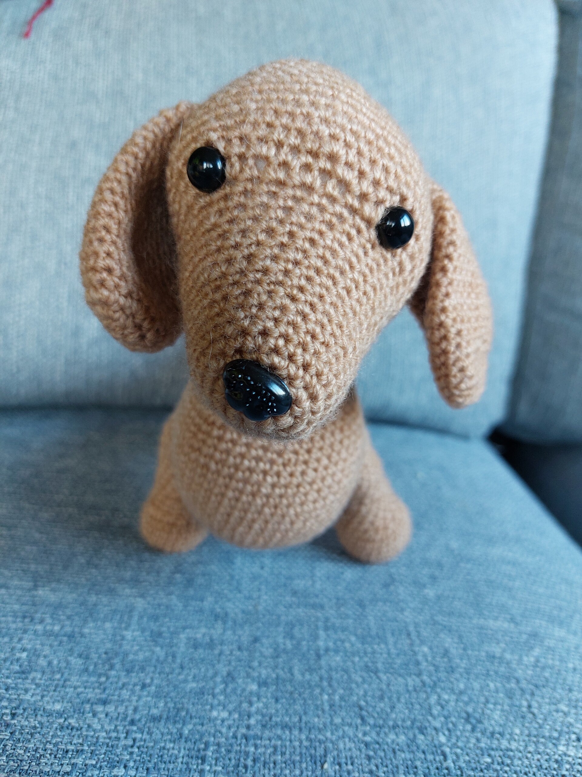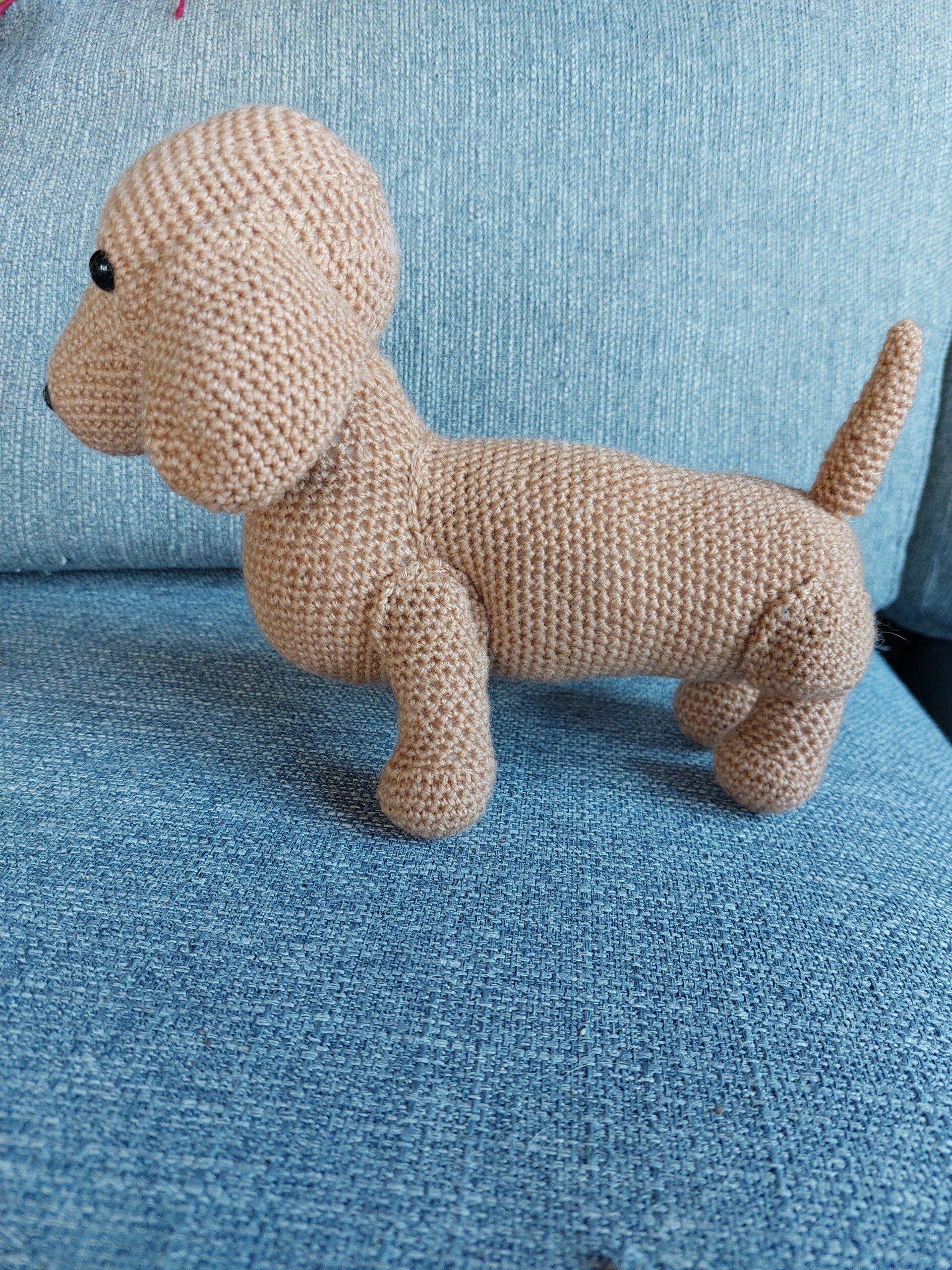 Voor onze teckel liefhebbers. Hij is gemaakt in zachte wol. Van poot to bovenkant kop is hij 18cm en van kop tot staart is hij 24cm lang